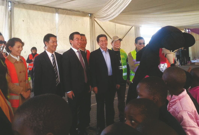 5月29日,集团公司驻津巴布韦分公司在津巴布韦华商会主办的第二届“迎六一”2016爱心无国界孤儿派对活动中,为当地孤儿捐赠笔记本等物品。图为中国驻津巴布韦大使黄屏与我集团公司驻津分公司总经理凌金祥在捐赠现场。(津宣)