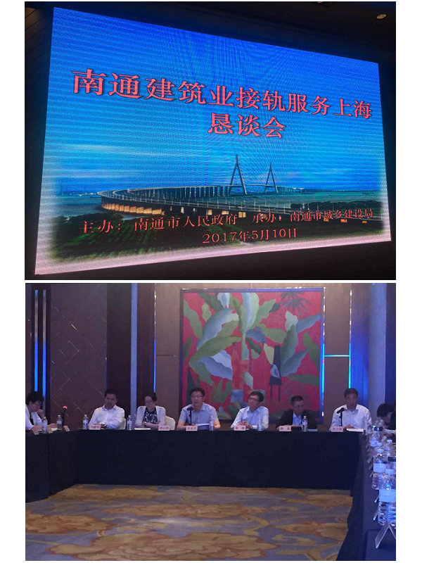 5月10日下午,南通建筑业接轨服务上海恳谈会在上海国信紫金山大酒店举行,南通市人民政府副市长吴永宏、上海市住房和城乡建设委员会副主任裴晓、南通市城乡建设局局长马建明、南通市城乡建设局副局长兼市建管局局长沈卫星等领导出席会议,集团公司董事长张向阳、副总经理兼上海分公司总经理邢光忠作为南通优秀建筑企业代表应邀出席恳谈会。  上海是南通建筑业的传统市场,此次恳谈会是在我市全面接轨上海的新形势下,为积极配