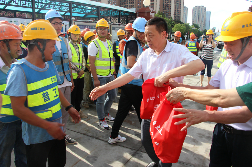 炎炎夏日,为进一步关心基层企业工会员工的身心健康,8月14日,南通市总工会叶新春副主席、权保部曹庆龙部长、副部长高立洪、机关在职支部书记顾宝亮赴三分公司轨道交通2号线4标段项目部看望慰问酷暑中仍坚守岗位的一线职工,亲手将夏季防暑降温物资送到职工手中,带给他们夏日的清凉。